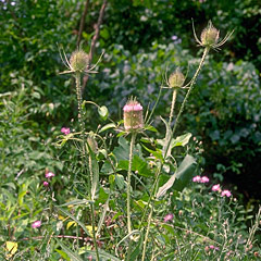 Dipsacus sylvestris (Dipsacaceae) - Teasel gets its name from the former use of its dried flower heads to "tease" yarn and fabric. This alien import blooms in late summer to early fall. (Photographed in PA)
