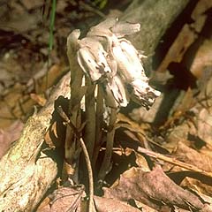 This member of the wintergreen family is saprophytic; it gets its nutrients from decaying plant matter rather than through photosynthesis. Because it has no chlorophyll and thus no green pigmentation, another name for it is "corpse plant". It was used for medicinal purposes by Native Americans. Indian pipes bloom in summer to early fall. (Photographed in PA)