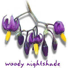 Solanum dulcamara -- Also called "Bittersweet", and a member of the tomato family, It blooms throughout summer. This plant is toxic, but isn't the "deadly nightshade" (belladonna), which is a european variant. (Photographed in WI)