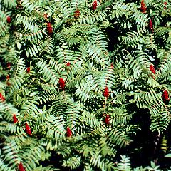 Be careful of Poison Sumac, which has white fruit that hangs down, not red fruit that sticks up...NEVER put anything in your mouth if you